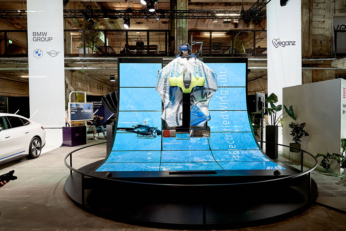 In the center, the “Electrified Wingssuit” as an interactive virtual reality experience, the BMW i4 eDrive40 Gran Coupé and the spatial staging of the MINI Vision Urbanaut.